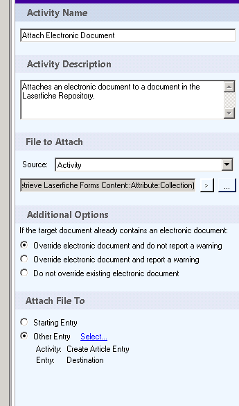 Chris, that's not quite correct. The Attach Electronic Document activity sets the electronic document component of a Laserfiche entry. It doesn't matter if that entry has image pages or not.