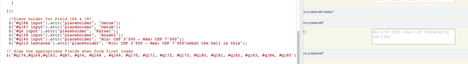 $("#q212 input").attr("placeholder", "Min: CHF 3'500 - Max: CHF 7'000\n what the hell is this");