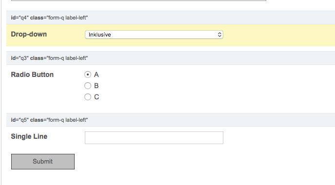1. q3 = Radio Button with Values: A, B, C