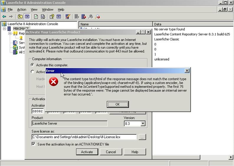 I have a customer that stopped using LaserFiche a few years back but now needs to access a file from LaserFiche. The server has since been virtualized and they need to activate LaserFiche. When they attempt the received an error. "The content type text/html of the response message does not match the content type of the binding.... The page cannot be displayed because an internal server error has occurred."