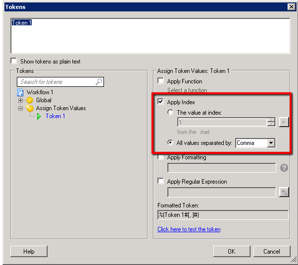 Click in the Apply Function section and add Split and enter the comma to split on. Then add a Remove Empty Items function to remove any blank values that might appear after the split.
