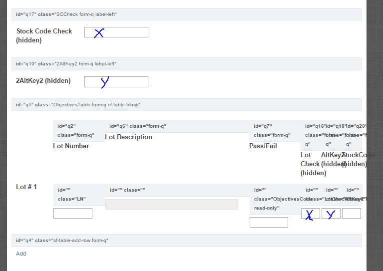 I have two columns in a table that I need checked against two respective single line fields. I'm trying to determine if Lot Check (hidden) has the same value as Stock Code Check (hidden). If they do not, I then need it to check AltKey2 (hidden) against 2AltKey2 (hidden). If those also do not match, I would like some sort of error message or warning to pop up letting the user know that these do not match. I have designated the fields that need to match up with an "x" or a "y". If either one match, then nothing needs to happen. My css classes are as follows -