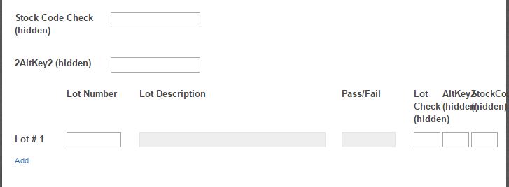 This checks the Lot Check (hidden) field against the Stock Code Check (hidden) field. If they match, the submit button is enabled. If not, it is disabled. The problem I am running into is that it only validates the first row of the table. I need it to check each row, and if even one is wrong, I need the submit button to be disabled (and ideally a message to let the user know which Lot # is not matching). A screenshot is attached. Any help is greatly appreciated.