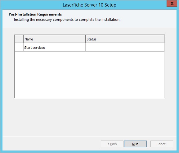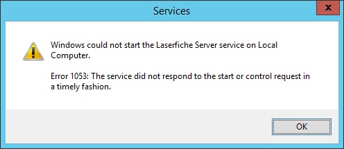 I am currently installing Laserfiche 10 on my Virtual Environment which is a Win Server 2012 R2. I have reached the post-requisites step of the Laserfiche Server installation. The services failed to be started. I have tried to start the LF Server service from the list of services but I am getting the following error message: 'Error: 1053: The service did not respond to the start or control request in a timely fashion'. Please find attached screenshot.