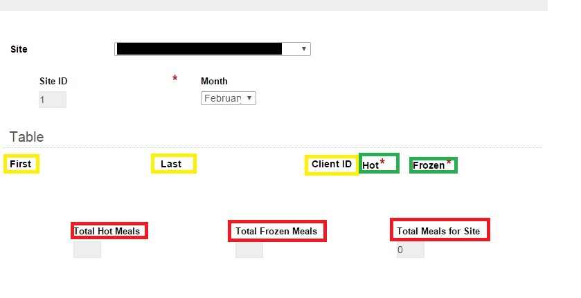 I have a form with a table that populates some of the fields from a database (Highlighted in yellow) some that are filled in by the user (Highlighted in green) and some that are calculated by the form(in red) . My plan is to use the submitted forms to find how many meals each site and each person has each month however when i try to configure fields during the "save to repository" process step to get data from the form i get errors like "Other: Bad field value ('Last Name'): The parameter is out of range or too long. [9020]" So far I have not found a solution or a better way to go about getting the information I need out of the form. What am I missing or is there a step I forgot?