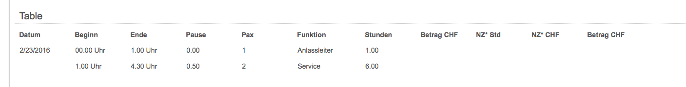 Time from Beginn to Ende minus Pause, multiplied by Pax = Stunden