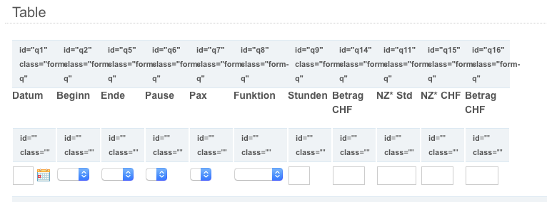 Make sure to add classes to your column fields (i.e. beginn, ende, nz...), and to change FormsServer on line 2 to your Forms server name.