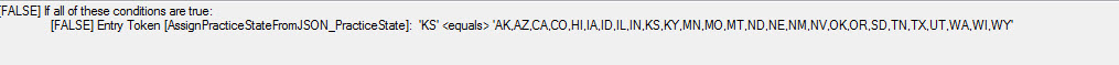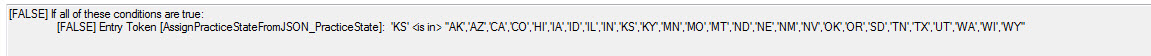 I am creating a Condition Decision in a Workflow. My condition states that a "{token} is in (AK,AZ,CA,CO,HI,IA,ID,IL,IN,KS,KY,MN,MO,MT,ND,NE,NM,NV,OK,OR,SD,TN,TX,UT,WA,WI,WY)". I know the value in the token is "KS", but it is not falling into this branch. What am I doing wrong? Do I need quotes around each value or something since the token value is a string?