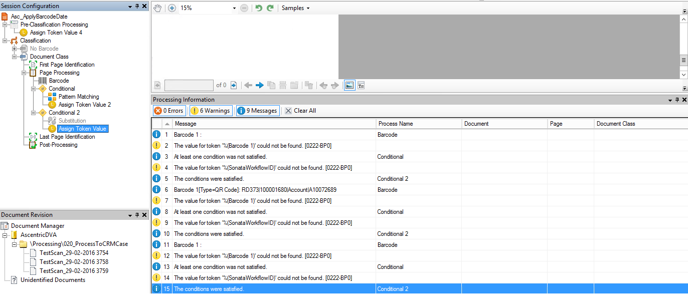 under processing information, at line 6, this is where the session reads the barcode successfully at page 2 but then at line 7 it says that 'value for token %Barcode 1 could not be found'.