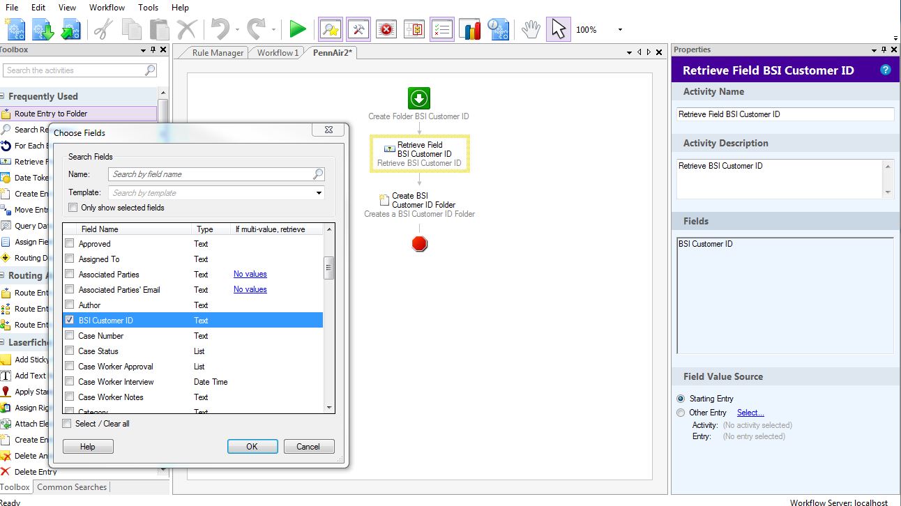 Workflow Designer 9.2.0.167, trying to create a workflow but I can't get it to do my 1st task which is Retrieve Field Value. error No entry was specified [0263-WF1]