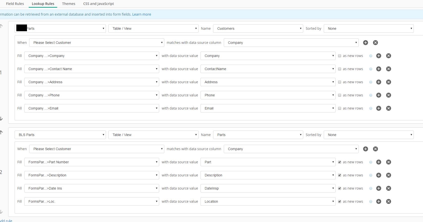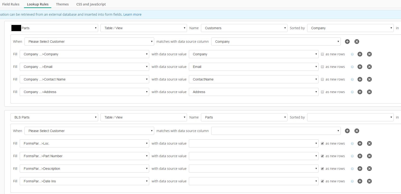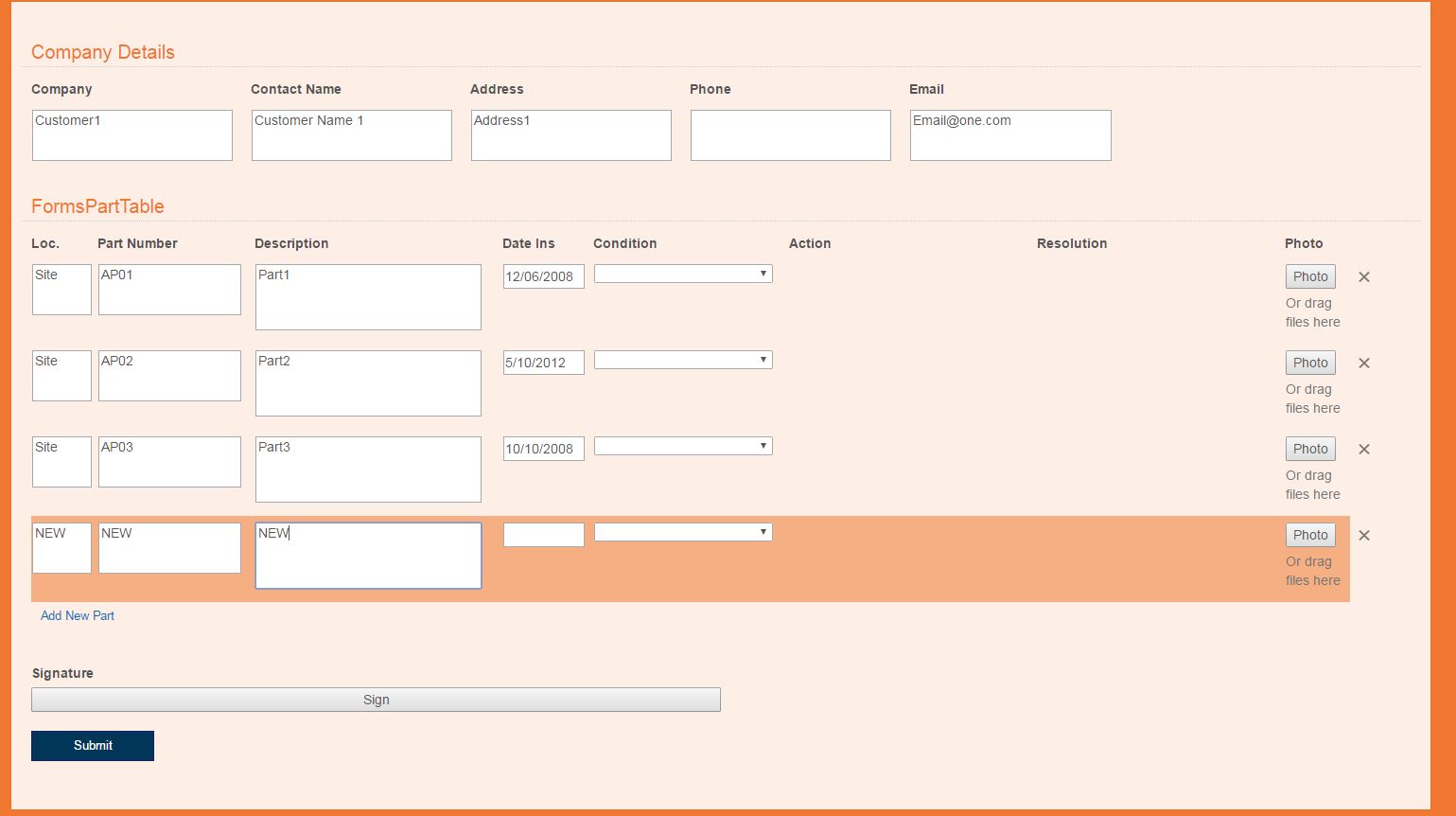 In forms there is a drop down that contains a list of customers. Once a customer is selected it then displays the list of corresponding parts to that customer (from the SQL Table). The operator can edit what they like and any changed fields (once submitted) then get updated back to the SQL table (via workflow), the problem I have is if they add a new part, it doesn't save back to the SQL table.