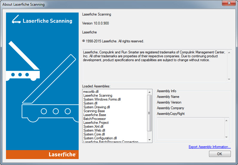 An exception occurs when displaying the Help | About dialog box in Laserfiche Scanning.