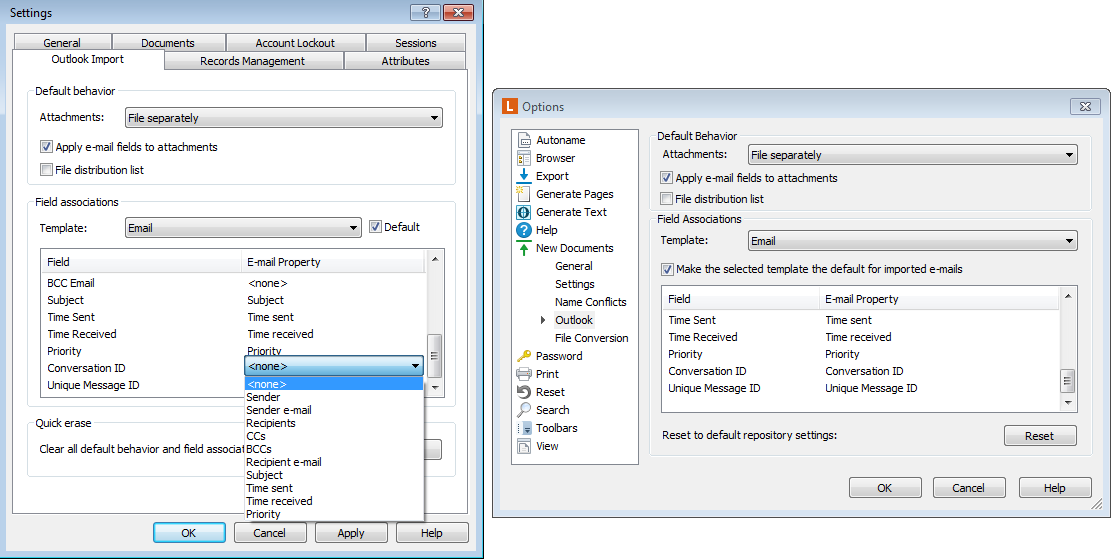 Within the "Tools>Options" menu in the Laserfiche Client, I have mapped the Outlook elements "Unique Message ID" and "Conversation ID" to metadata fields with the same name. All other Outlook elements have been mapped to same named metadata fields as well. I see that similar options appear in the Admin Console within the "Repository Options>Default Outlook Import Options" menu, but there's no Unique Message ID or Conversation ID elements to map.