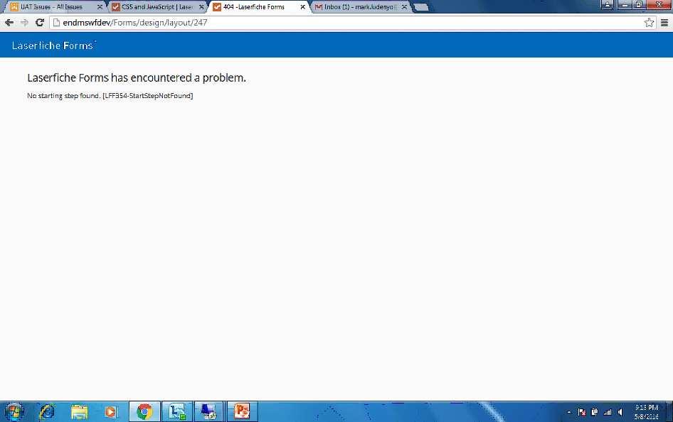I have developed a four step process that I need to deploy to a different server. On deploying I get the error that "No starting step found". I get this error when I try to open the initial form. The process has three other forms whichare opened ok apart from the starting one. I get the same error when I try to submit the form. What may cause this. This is Forms 10. Image attached