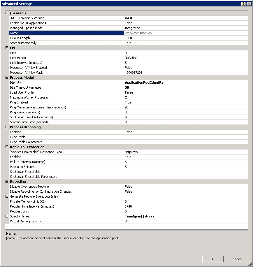Could you open IIS, go to application pools, right click on WebAccessAppPool, click Advanced settings, and check the Request Limit? The value should be '0', which means the app pool can process an unlimited number of requests.