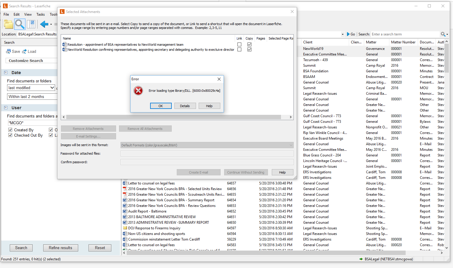 I currently have a user who is experiencing an issue when trying to email from the LF Client. The LF Client is version 9.2, they are on a Windows 10 machine and using Office 365. No other users are experiencing this issue. They have already tried running a repair install on Outlook and also an unistall and reinstall of Outlook as well. Below is the full details of the error: