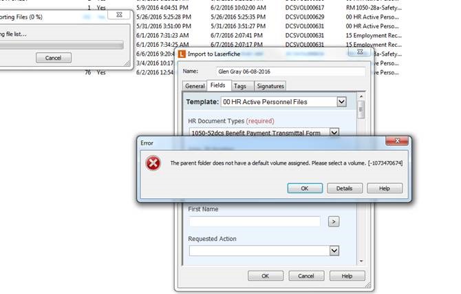 I am currently experiencing an issue with a user who is trying to drag and drop a PDF into the same folder as another employee who has the same rights and permissions. The original user though gets an error when trying to do so. I have provided the screen shot below of the error and also of what selection the user has for the default volume.